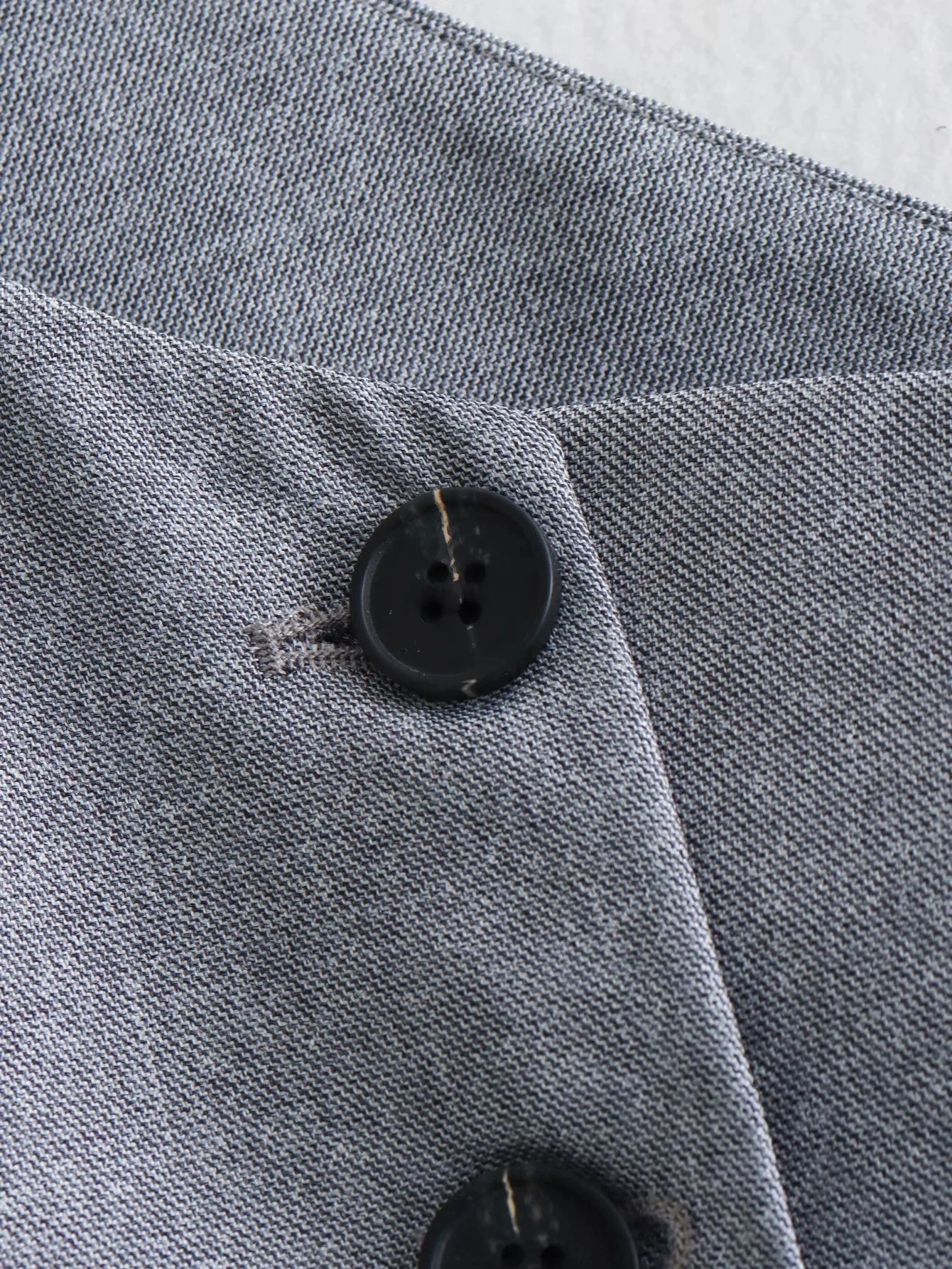 Fechamento frontal com botões, oferecendo um ajuste clássico e elegante